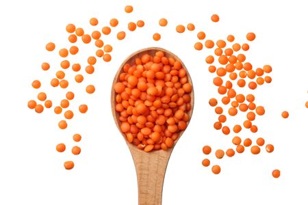 Yellow and red lentils in a wooden spoon on a white background. high angle view.