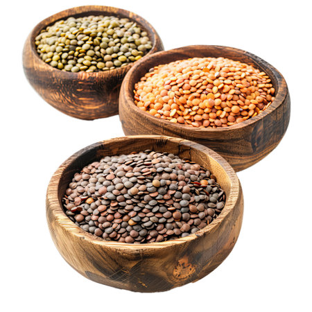 Brown, green and red lentils are filling wooden bowls, isolated on a white background
