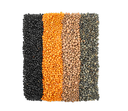 Three varieties of red, black and brown lentils are in the shape of a circle on a white background