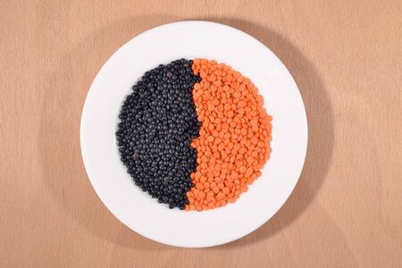 Red lentils in wooden plate on black stone table background. Top view, copy space.