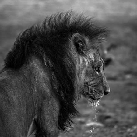 Black and white photo of a wild African lion, game drive wildlife safari, wild animal portrait, eco travel and tourism, nature of South Africa