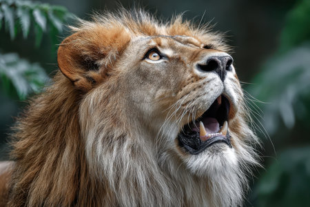 A lion roars with its mouth open in a natural setting