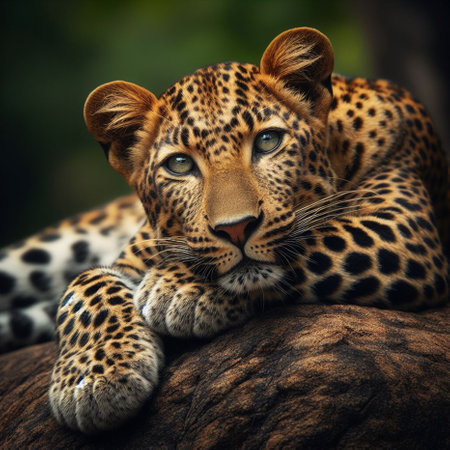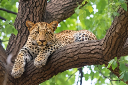 An AI generated illustration of a majestic leopard laying down in a tree