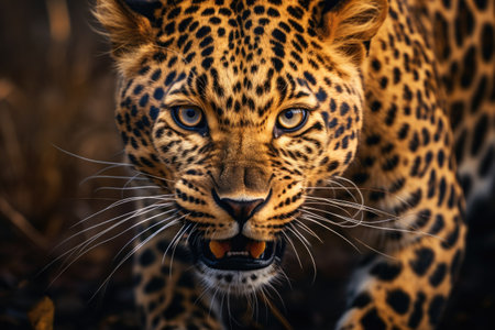 Detailed close-up capturing fierce gaze of perfect leopard. Close-up of majestic leopard with intense gaze in wilderness, exotic big cat predator. Animal wildlife concept. Copy ad text space. Gen Ai