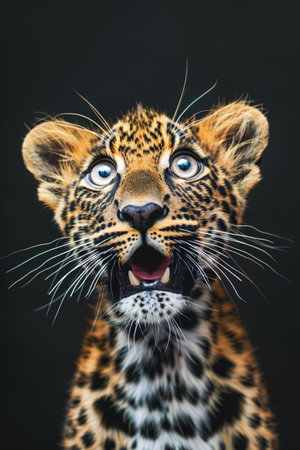 Stunning leopard portrait on a black background, showing vivid details perfect for educational content, wildlife campaigns, or graphic designs. Copy space for text. Surprised animal. Generative AI.