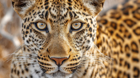 Up close and personal with perfect leopard in natural habitat. Showcasing fierce and beautiful gaze as wild predator in exotic natural world. Animal themes wildlife concept. Copy ad text space. Gen Ai