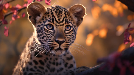 An AI generated illustration of a leopard's head illuminated by the warm light of the sun