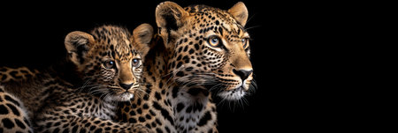 Male leopard and cub portrait with space for text, object on right side, ideal for adding captions