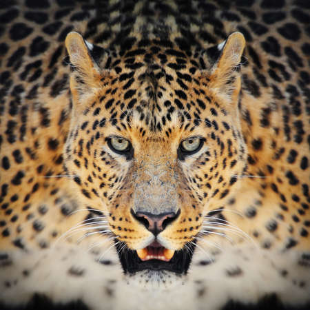The proud face of a red-spotted powerful leopard cat, a black background muzzle in the center.
