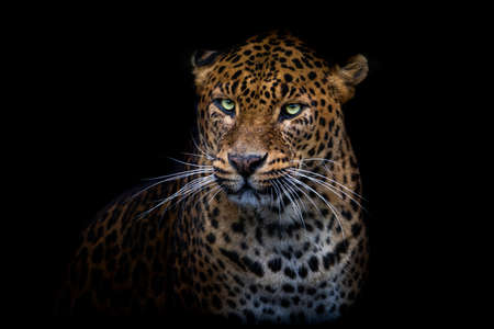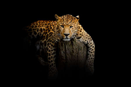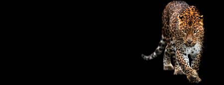 Leopard in the night. A Far Eastern leopard is hunting in the dark. A large beautiful predatory cat is creeping up isolated on a black background.