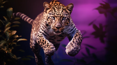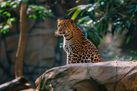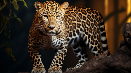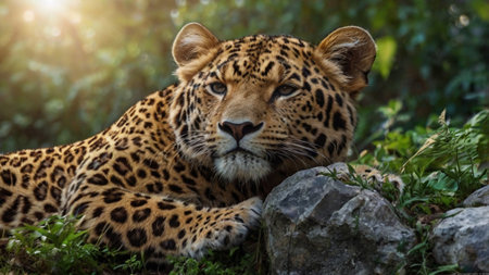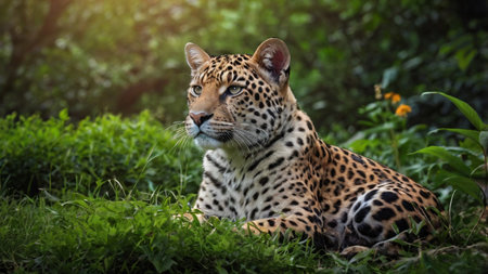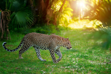 In a vibrant, sunlit woodland, a leopard with a distinct spotted coat moves gracefully across the emerald grass. The warm light of the setting sun casts a golden glow, illuminating the surrounding foliage. This serene highlights encounter the natural beauty and elegance of wildlife in their habitat.