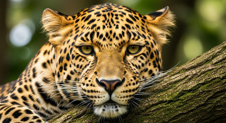 Leopard lying on a tree branch in the forest. Panthera pardus