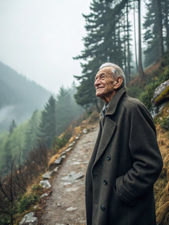 Elderly man enjoying a tranquil mountain walk on a misty day.