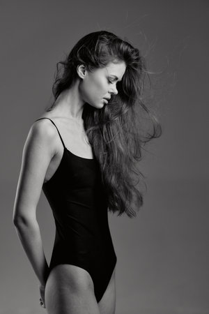 Young woman in black swimsuit posing confidently with wind-blown hair on gray background