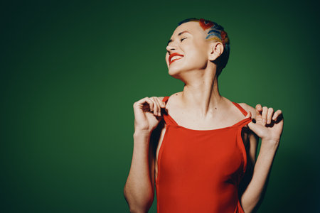 woman with colorful hair in red dress smiling joyfully, vibrant makeup, bright green background, short hairstyle, happiness and freedom expression