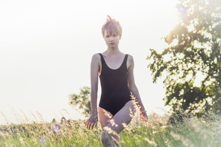 Woman in swimsuit walking across field scenic photography. Picture of person with sunshine on background. High quality wallpaper. Photo concept for ads, travel blog, magazine, article