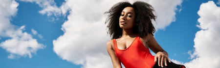 Close up portrait of a young african woman in swimsuit standing over blue wall, looking up