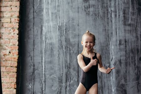 Smiling girl gymnast posing near a black textured wall.