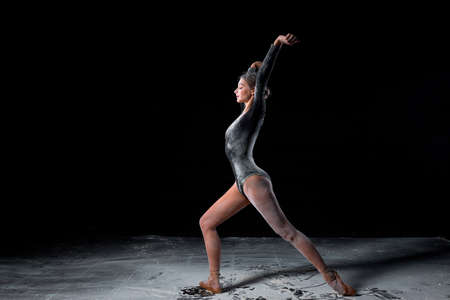 Dancing in flour concept. Slim beautiful female adult woman dancer in dust, fog. Lady is wearing black bodysuit, making dance element gracefully on isolated black background, side view