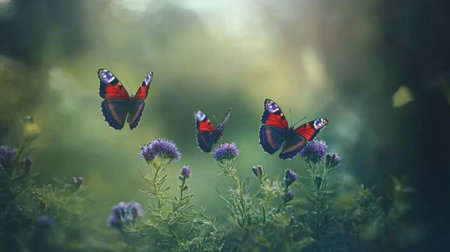 Beautiful purple butterfly bush with red and black butterflies on it, green background, blurred background, sunny day, photo taken from above, high resolution, high quality, high detail, hyper-detailed photography. --chaos 30 --ar 16:9 --v 6.1 Job ID: ec2c73b9-eded-42a2-8ac6-e7e8d1bc7a54