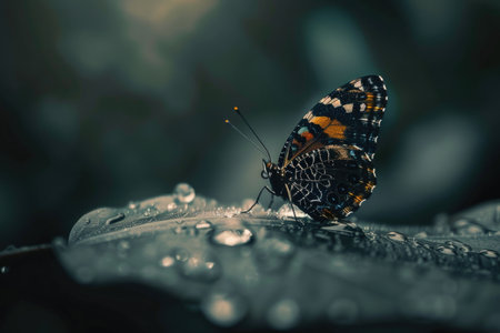 Butterfly on a leaf with morning dew. Macro nature photography. Tranquility and beauty in wildlife concept. Design for environmental campaigns, nature blog, educational material