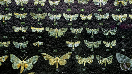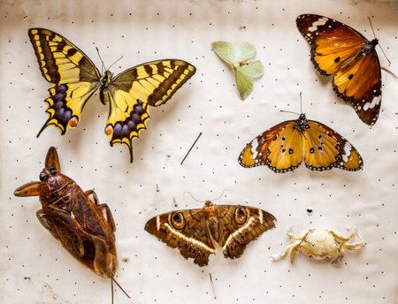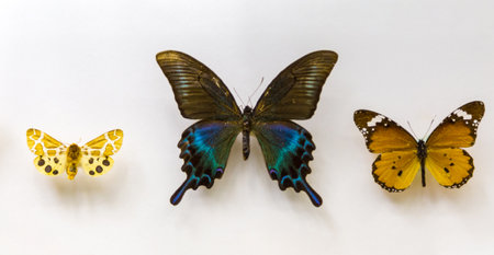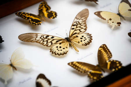 It is a lot of butterflies in the collections of the scientist attached by needles to a white background. high quality photo
