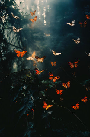 Butterflies dance in a mystical forest, a breathtaking scene of nature's artistry.