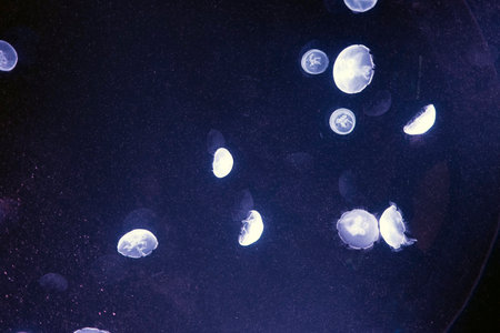 Group of fluorescent jellyfish swimming underwater aquarium pool with purple neon light. The Lychnorhiza lucerna marble jellyfish in dark water, ocean. Theriology, tourism, diving, undersea life.