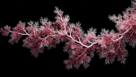 Vibrant red coral branches with water droplets, set against a black backdrop