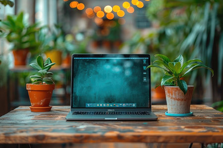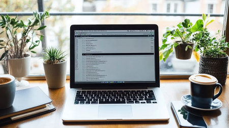 Laptop computer sitting on top of wooden desk next to window. Generative AI.