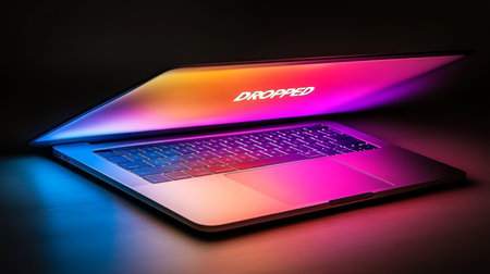 Modern Laptop, Dropped Neon Text, Vibrant Colors, Soft Lights, Technology, Abstract Background