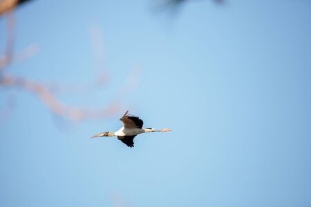 Close to a full moon as a Wood stork Mycteria Americana flies over the Corkscrew Swamp Sanctuary of Naples, Florida