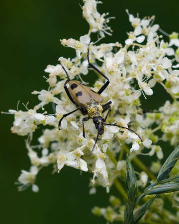 Spotted Longhorn (Rutpela maculata) beetle foraging on Umbellate flower in a forest