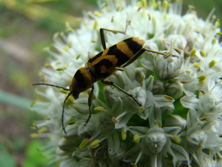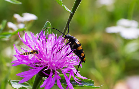 On the flower in the wild is the beetle Strangalia attenuata