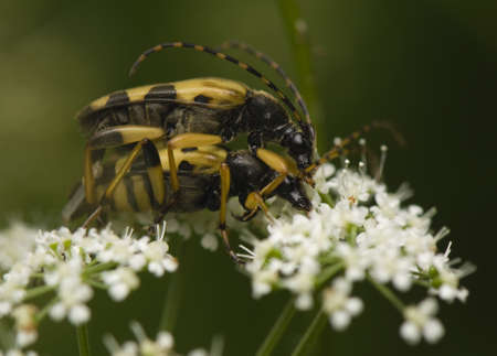 Closeup on a Spotted longhorn beetle, Leptura maculata on the white flower of a Wild carrot, Daucus carota.