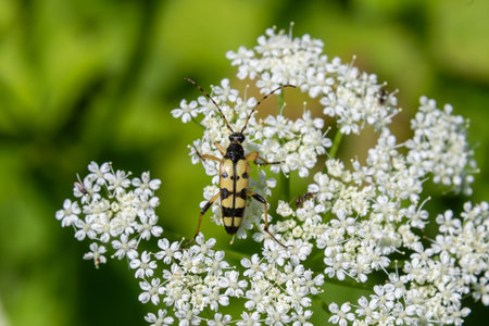 four-banded longhorn beetle is seen exploring small white flowers vibrant green setting showing intricate details of its distinct yellow and black color patterns.