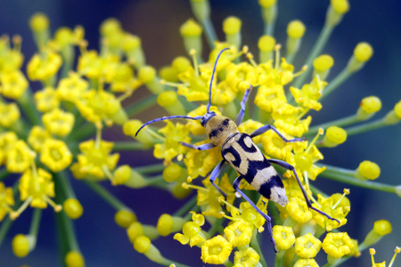Longhorn yellow beetle on yellow flowers close-up.