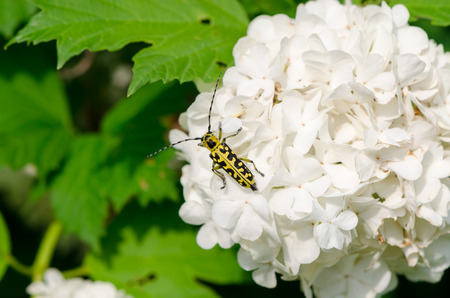 snowball on a white inflorescence downwind crawls small beautiful black and yellow coleopteran beetle with long mustache