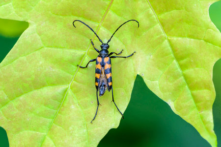 Closeup shot of beautiful longhorn beetle (Leptura quadrifasciata) sitting on green leaf in summer. Black Beetle with four continuous transverse yellow bands