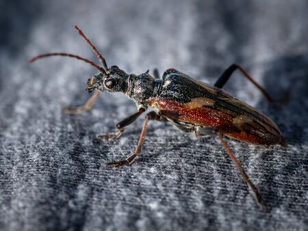 A beautiful longhorn beetle (Rhagium bifasciatum, Cerambycidae) sitting on fabric