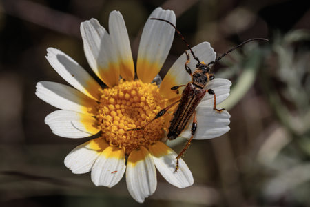 Close-up of a longhorn beetle exploring a crown daisy flower in a natural setting
