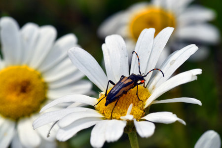 Black and yellow spotted longhorn beetle climbing on a white flower growing in a meadow. Natural light and blurry green background.