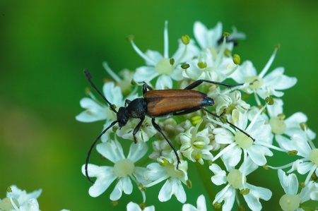 Spotted Longhorn (Rutpela maculata) beetle foraging on Umbellate flower in a forest