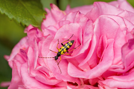 Longhorn beetle on a pink rose, macro shot, selective focus