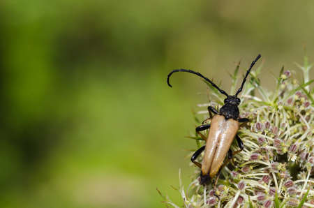 Closeup on a Spotted longhorn beetle, Leptura maculata on the white flower of a Wild carrot, Daucus carota.