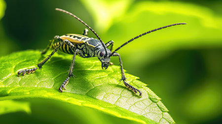 Spotted longhorn beetle with long antennae is standing on a green leaf