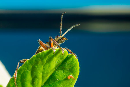 Insect on a bright green leaf, featuring a detailed shot of its legs and antennae, with a focus on the contrast between the insect and its environment