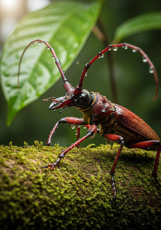 Male Red-brown Longhorn Beetle close up by a natural green background