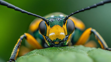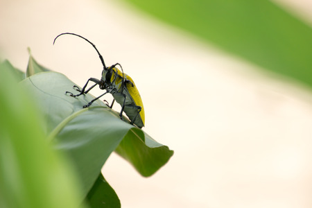 long horned beetle on green leaves close up. colorful bright beetle on a leaf. copy space