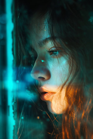 A contemplative young woman gazes slightly upward neon yellow wires framing her delicate face. The soft light creates an ethereal quality highlighting her thoughtful expression and.